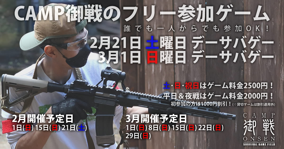 2月21日(土) 🌞フリー参加デーサバゲー開催予定!