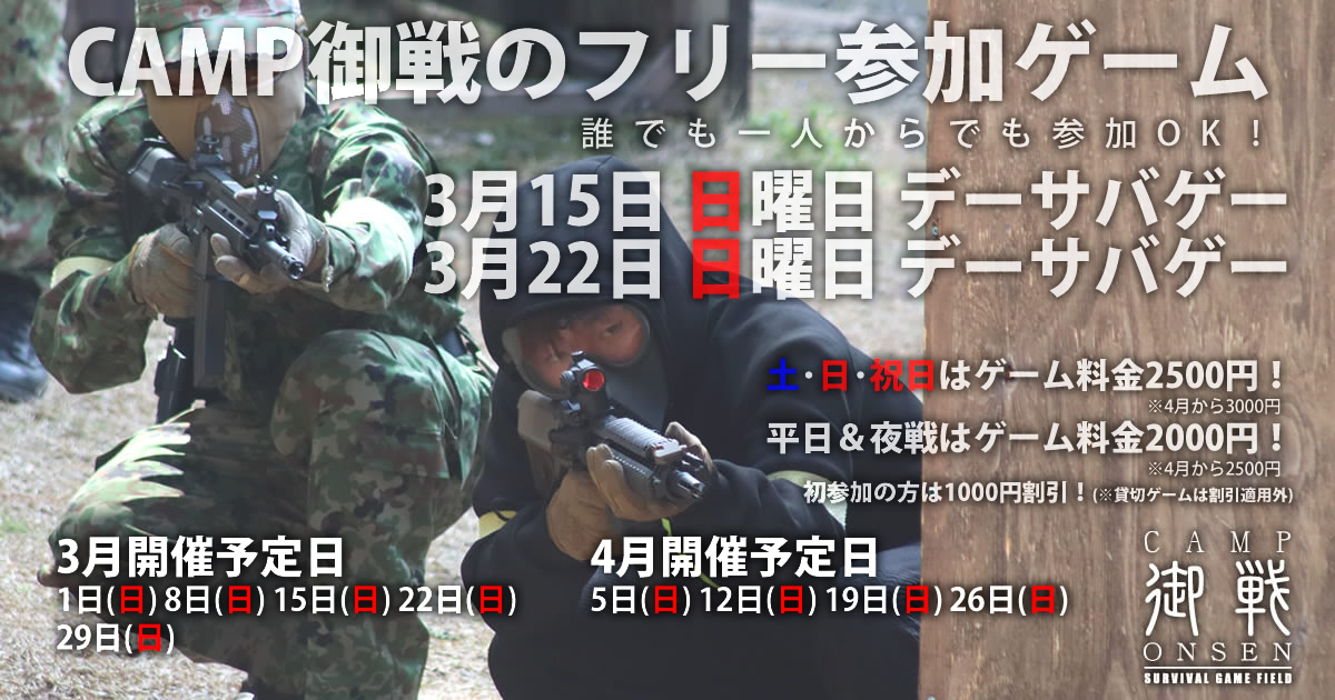 3月22日(日) 🌞フリー参加デーサバゲー開催予定!