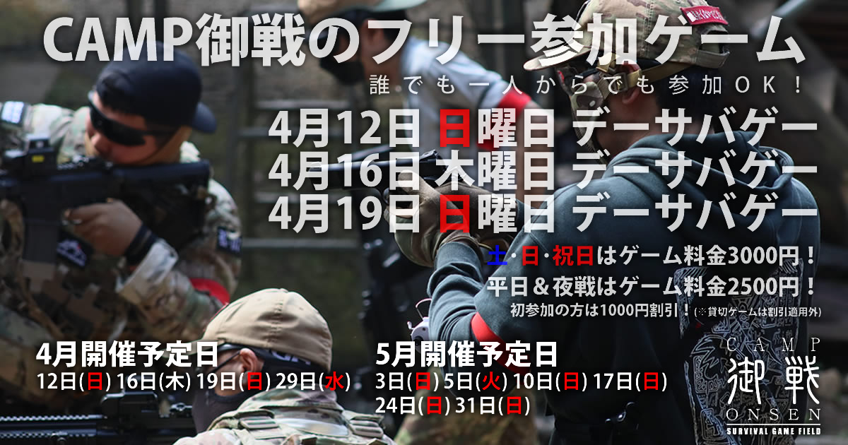4月16日(木) 🌞フリー参加デーサバゲー開催予定!